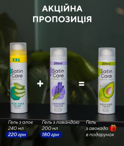 Satin Care Aloe Гель для гоління 240мл + Satin Care Lavanda Гель для гоління 200 мл = Satin Care Avocado Гель для гоління 200мл в подарунок 🎁