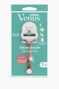 Gillette Venus Deluxe Smooth Sensitive Rosegold – преміальний жіночий верстат для гоління, створений спеціально для чутливої шкіри. Завдяки 5 ультратонким лезам та технології SkinCushion™, верстат забезпечує максимально гладке гоління без подразнень. Металева ручка Rosegold додає елегантності й забезпечує зручність у використанні, а тримач для душу дозволяє зберігати верстат у зручному місці.